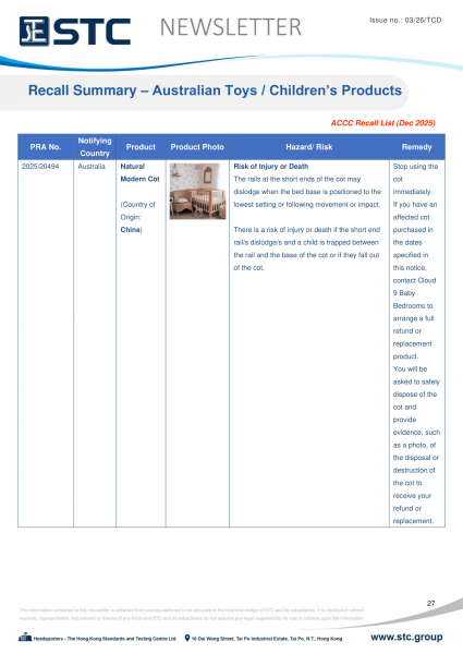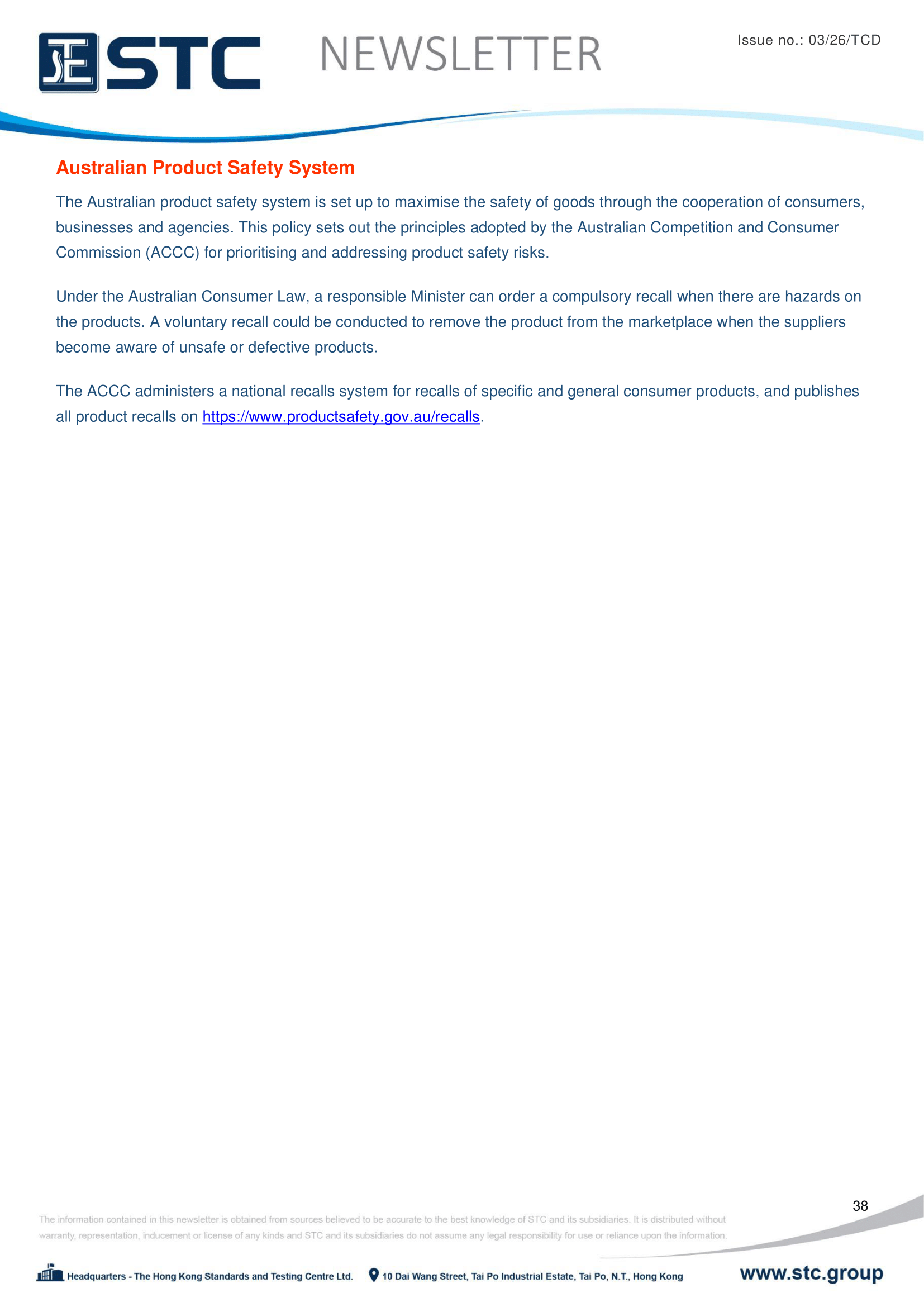 The ACCC administers a national recall system for recalls of specific and general consumer products, and publishes all product recalls on https://www.productsafety.gov.au/recalls.