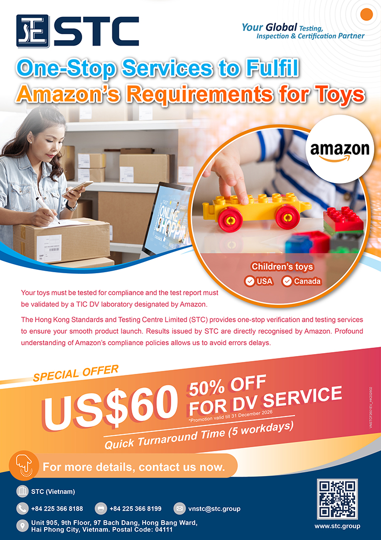 The Hong Kong Standards and Testing Centre Limited (STC) provides one-stop verification and testing services to ensure your smooth product launch. Results issued by STC are directly recognized Amazon. Profound understanding of Amazon’s compliance policies allows us to avoid errors delays