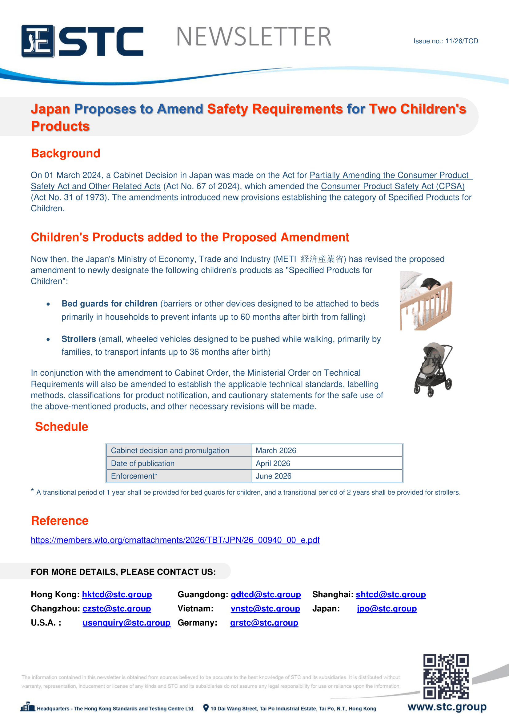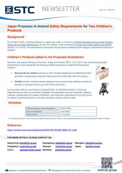 On 01 March 2024, a Cabinet Decision in Japan was made on the Act for Partially Amending the Consumer Product Safety Act and Other Related Acts (Act No. 67 of 2024), which amended the Consumer Product Safety Act (CPSA) (Act No. 31 of 1973). The amendments introduced new provisions establishing the category of Specified Products for Children.