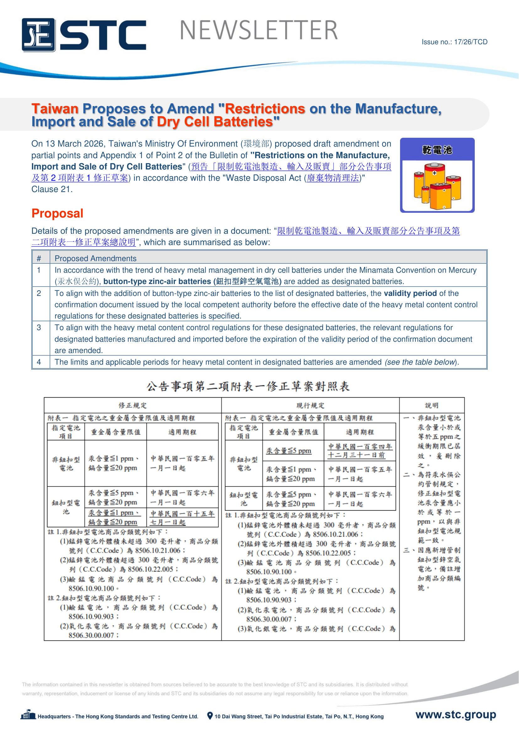 On 13 March 2026, Taiwan's Ministry Of Environment (環境部) proposed draft amendment on partial points and Appendix 1 of Point 2 of the Bulletin of "Restrictions on the Manufacture, Import and Sale of Dry Cell Batteries" (預告「限制乾電池製造、輸入及販賣」部分公告事項及第2項附表1修正草案) in accordance with the "Waste Disposal Act (廢棄物清理法)" Clause 21.