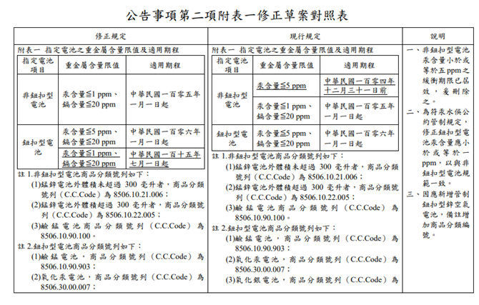 In accordance with the trend of heavy metal management in dry cell batteries under the Minamata Convention on Mercury (汞水俣公約), button-type zinc-air batteries (鈕扣型鋅空氣電池) are added as designated batteries. |