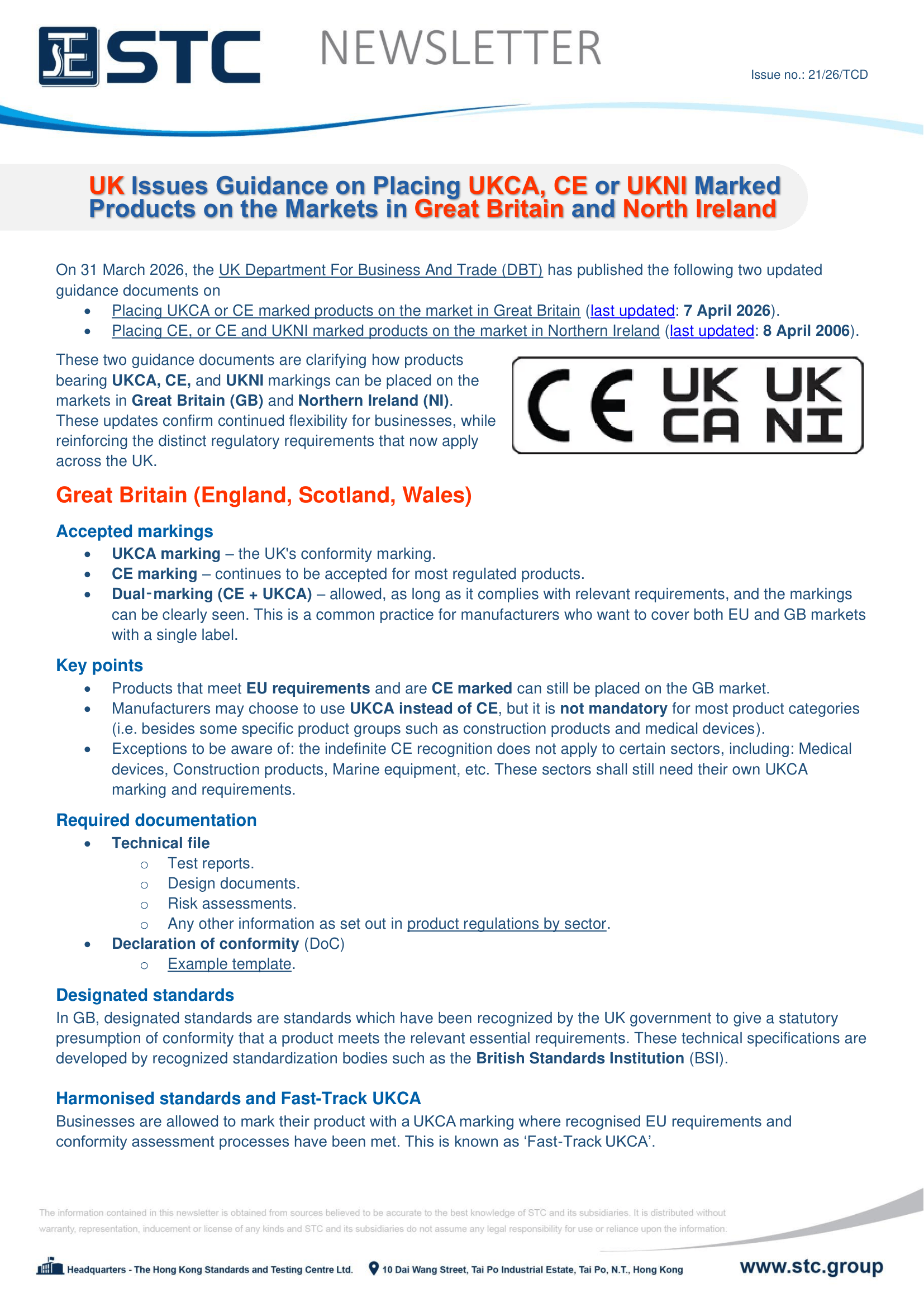 These two guidance documents are clarifying how products bearing UKCA, CE, and UKNI markings can be placed on the markets in Great Britain (GB) and Northern Ireland (NI). These updates confirm continued flexibility for businesses, while reinforcing the distinct regulatory requirements that now apply across the UK.