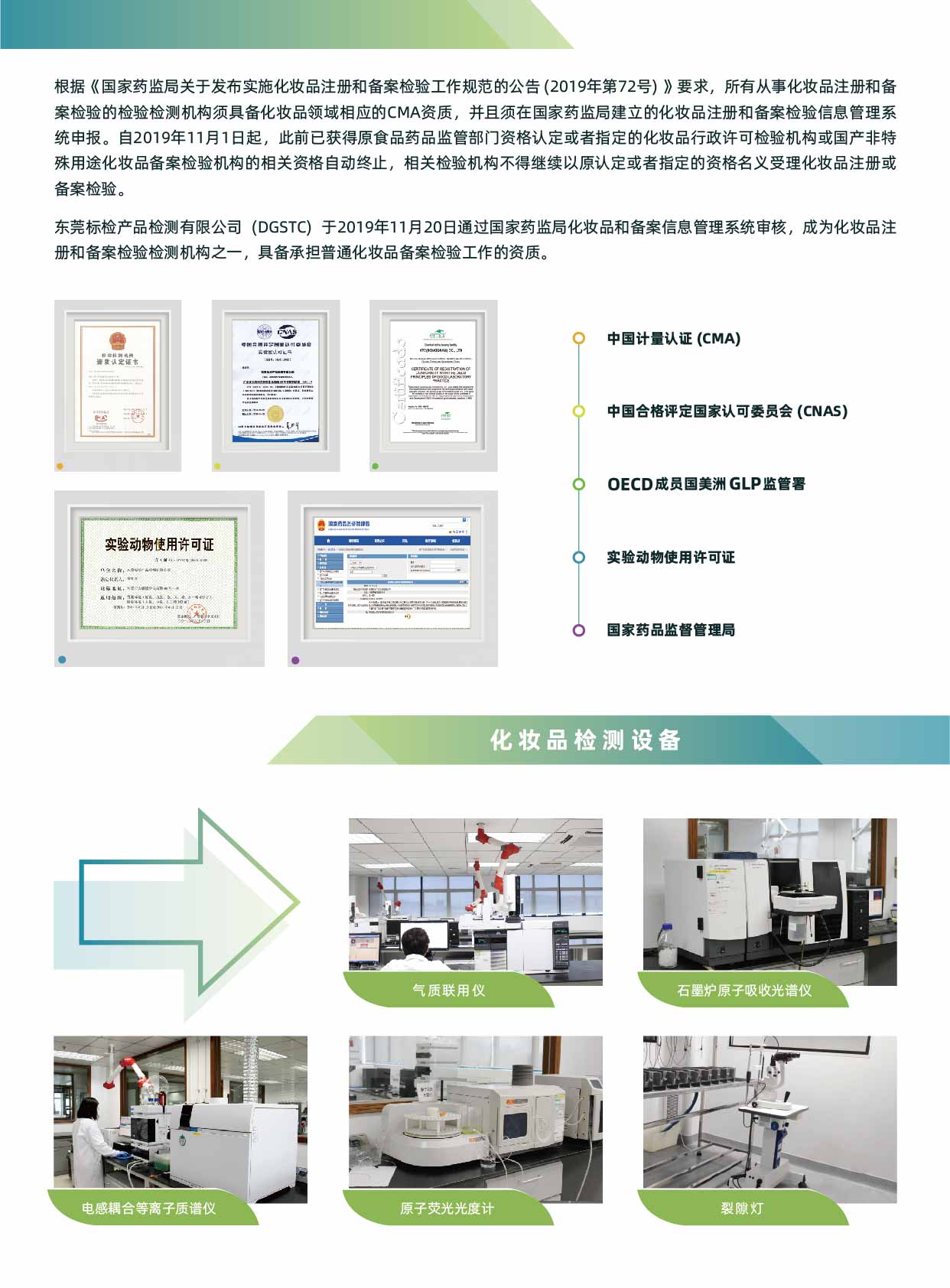 东莞标检产品检测有限公司(DGSTC)于2019年11月20日通过国家药监局化妆品和备案信息管理系统审核,成为化妆品注册和备案检验检测机构之一,具备承担国产非特殊用途化妆品备案检验工作的资质。