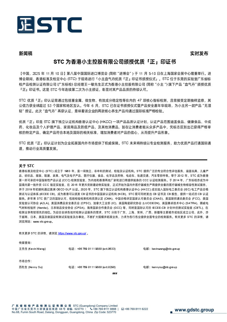 第八届中国国际进口博览会 (简称“进博会”) 于 11 月 5-10 日在上海国家会展中心隆重举行。进博会期间,香港标准及检定中心 (STC) 于现场进行「小主血气丹优质『正』印证书颁授仪式」。STC 位于东莞的实验室广东省标检产品检测认证有限公司 (广东标检) 总经理王一敏先生正式为香港小主控股有限公司 (简称“小主“) 旗下产品“血气丹”颁授优质『正』印证书。这是 STC 今年连续第二次为小主颁证,彰显对其产品品质的持续认可。