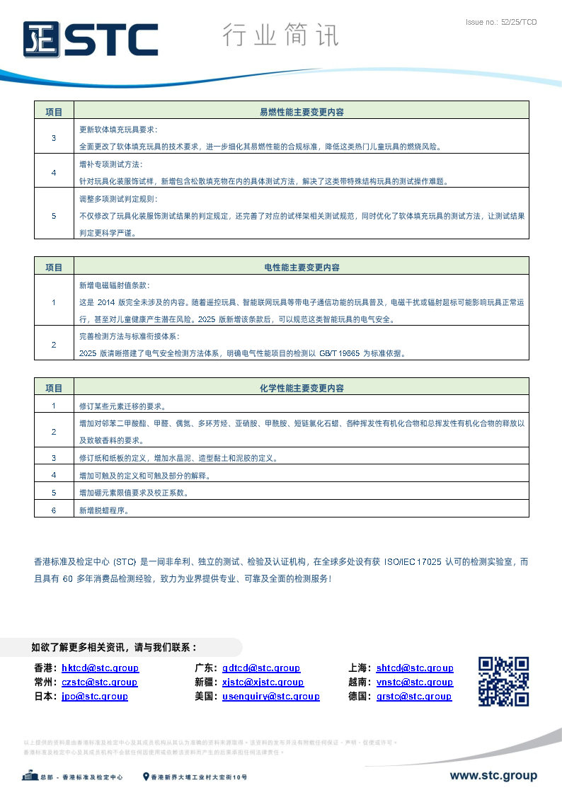 2025 年 10 月 5 日,国家市场监督管理总局和国家标准化管理委员会联合发布了 GB 6675 系列标准 2025 版 (GB 6675.1-2025 玩具安全第 1 部分:基本规范;GB 6675.2-2025 玩具安全第 2 部分:机械与物理性能;GB 6675.3-2025 玩具安全第 3 部分:易燃性能;GB 6675.4-2025 玩具安全:特定元素的迁移),计划自 2026 年 11 月 1 日起实施,届时将替代旧版的 GB 6675 系列标准 2014 版。新版本的标准为玩具产品的安全性能和材料安全设定了更为严格的要求,涵盖了机械物理性能、电性能、易燃性能和化学性能;此系列标准技术要求上主要基于国际玩具安全标准 ISO 8124-1 (机械与物理性能)、ISO 8124-2 (易燃性能) 和 ISO 8124-3 (特定元素的迁移),IEC 62115 (电玩具的安全),也做了一些参数和要求的修订。