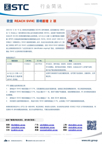2025 年 12 月 15 日,欧洲化学品管理局 (ECHA) 发布消息称,成员国委员会 (MSC) 在 12 月会议上一致同意将正己烷认定为高度关注物质 (SVHC),这是首个因具有同等关注水平 (ELOC) 的神经毒性而被认定的物质。4,4’-[2,2,2-三氟-1-(三氟甲基)亚乙基]双酚 (BPAF) 及其盐则因其明确的生殖毒性被认定为 SVHC。ECHA 计划于 2026 年 2 月将这 2 项物质列入 SVHC 候选物质清单。此外,在此次会议的纪要上提到 4,4’-二羟基二苯甲烷 (BPF) 的 SVHC 认定提案在会议前被撤回,但在 ECHA SVHC 意向登记册上该物质的状态仍为“认定正在进行中 (Identification ongoing)”因此,该项物质是否撤出 SVHC 认定有待官方的最终信息。
