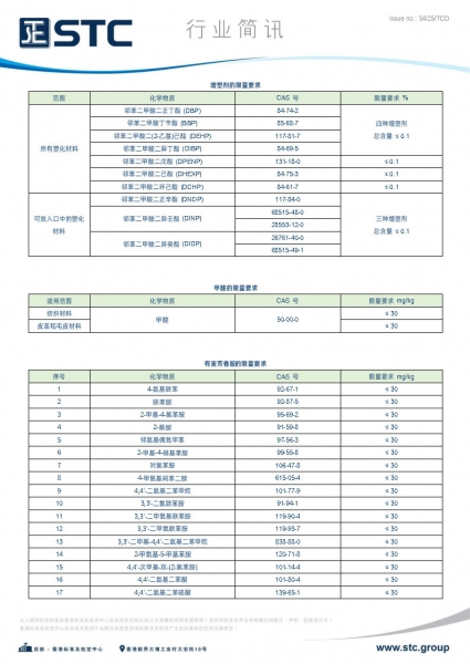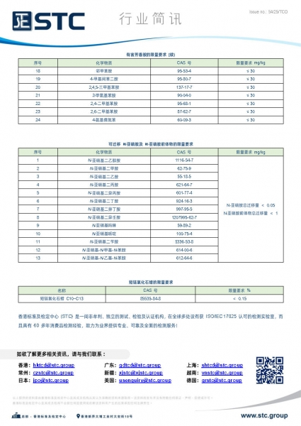 - 增加了增塑剂、甲醛、可分解有害芳香胺、pH (应符合 GB 18401 的 A 类规定)、可迁移 N-亚硝胺及 N-亚硝胺前体物和短链氯化石蜡的限量要求和测试方法。 |