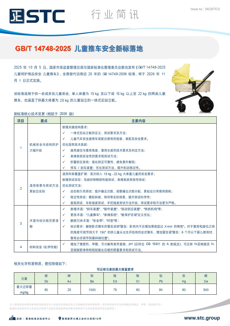 2025 年 10 月 5 日,国家市场监督管理总局与国家标准化管理委员会联合发布《GB/T 14748-2025 儿童呵护用品安全儿童推车》,全面替代沿用近 20 年的 GB 14748-2006 标准,将于 2026 年 11 月 1 日正式实施。