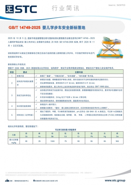 2025 年 10 月 5 日,国家市场监督管理总局与国家标准化管理委员会联合发布《GB/T 14749 – 2025 儿童呵护用品安全婴儿学步车》,全面替代沿用近 20 年的 GB 14749-2006 标准,将于 2026 年 11 月 1 日正式实施。