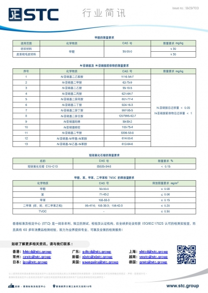 - 增加了增塑剂、甲醛、可分解有害芳香胺染料、pH (应符合 GB 18401 的 A 类规定)、可迁移 N-亚硝胺及N-亚硝胺前体物、短链氯化石蜡,和甲醛、苯、甲苯、二甲苯及总挥发性有机化合物 (TVOC) 的释放量的限量要求和测试方法。 |