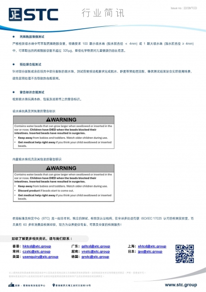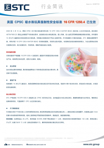 2026 年 3 月 12 日,美国 CPSC 关于吸水珠玩具专项法规 16 CFR 1250.4 WATER BEAD (吸水珠) 已正式开始生效。该法规在 ASTM F963-23 基础上新增更严苛的安全要求,旨在解决吸水珠玩具误食、插入耳鼻、吸入窒息及丙烯酰胺毒性等致命风险。所有面向 14 岁以下儿童的吸水珠玩具及含水珠玩具,均需通过合规测试方可进入美国市场。作为权威第三方测试实验室,STC 紧跟法规更新节奏,率先开发 16 CFR 1250.4 WATER BEAD 专项测试服务,凭借专业技术团队、标准测试设备及精准检测能力,为企业提供全流程合规测试支持,助力规避召回、罚款风险,顺畅打通美国出口通道。