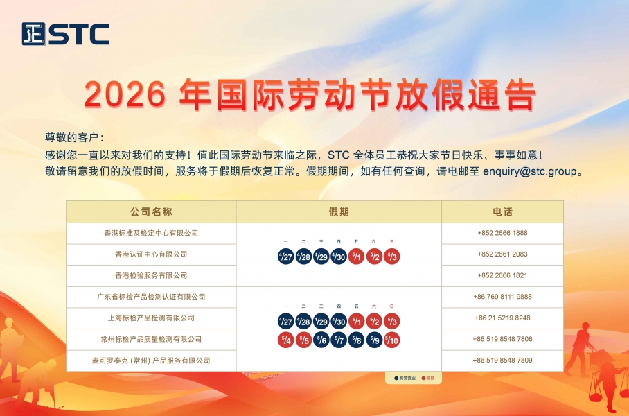 尊敬的客户:感谢您一直以来对我们的支持!值此国际劳动节来临之际,STC 全体员工恭祝大家节日快乐、事事如意!敬请留意我们的放假时间,服务将于假期后恢复正常。假期期间,如有任何查询,请电邮至 enquiry@stc.group。