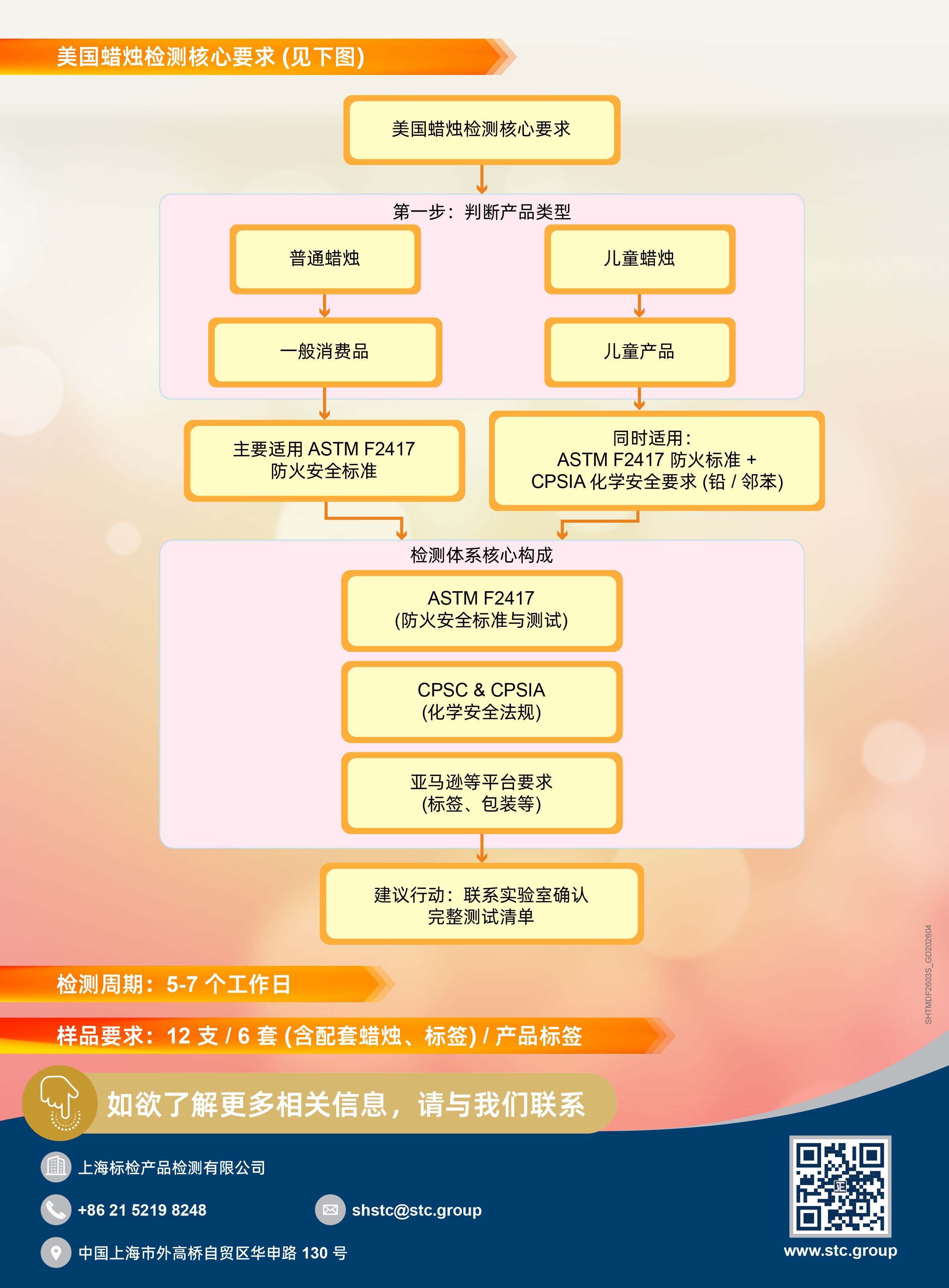 美国消费品安全委员会规定一般消费品:如普通家用蜡烛,遵循自愿性原则进行检测,但若引发事故将面临严厉处罚。儿童产品:针对12岁及以下儿童设计或使用的蜡烛,必须符合强制性标准(包括ASTM F2417及CPSIA的化学限制),并提供有效的儿童产品证书才能销售。