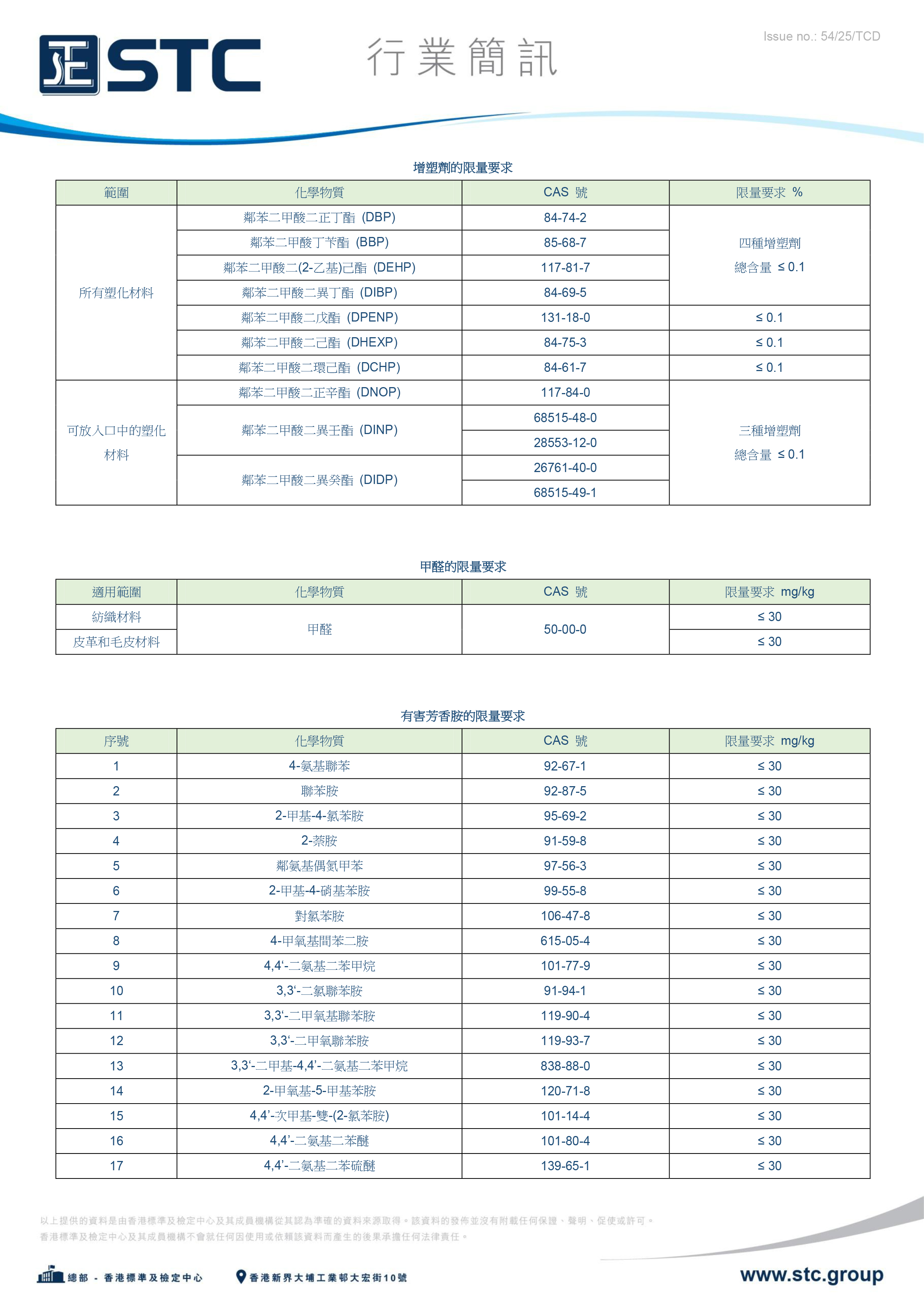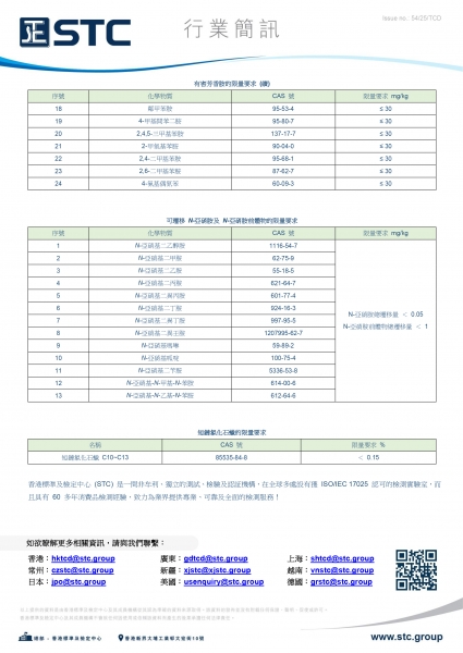 - 增加了增塑劑、甲醛、可分解有害芳香胺、pH (應符合 GB 18401 的 A 類規定)、可遷移 N-亞硝胺及 N-亞硝胺前體物和短鏈氯化石蠟的限量要求和測試方法。 |