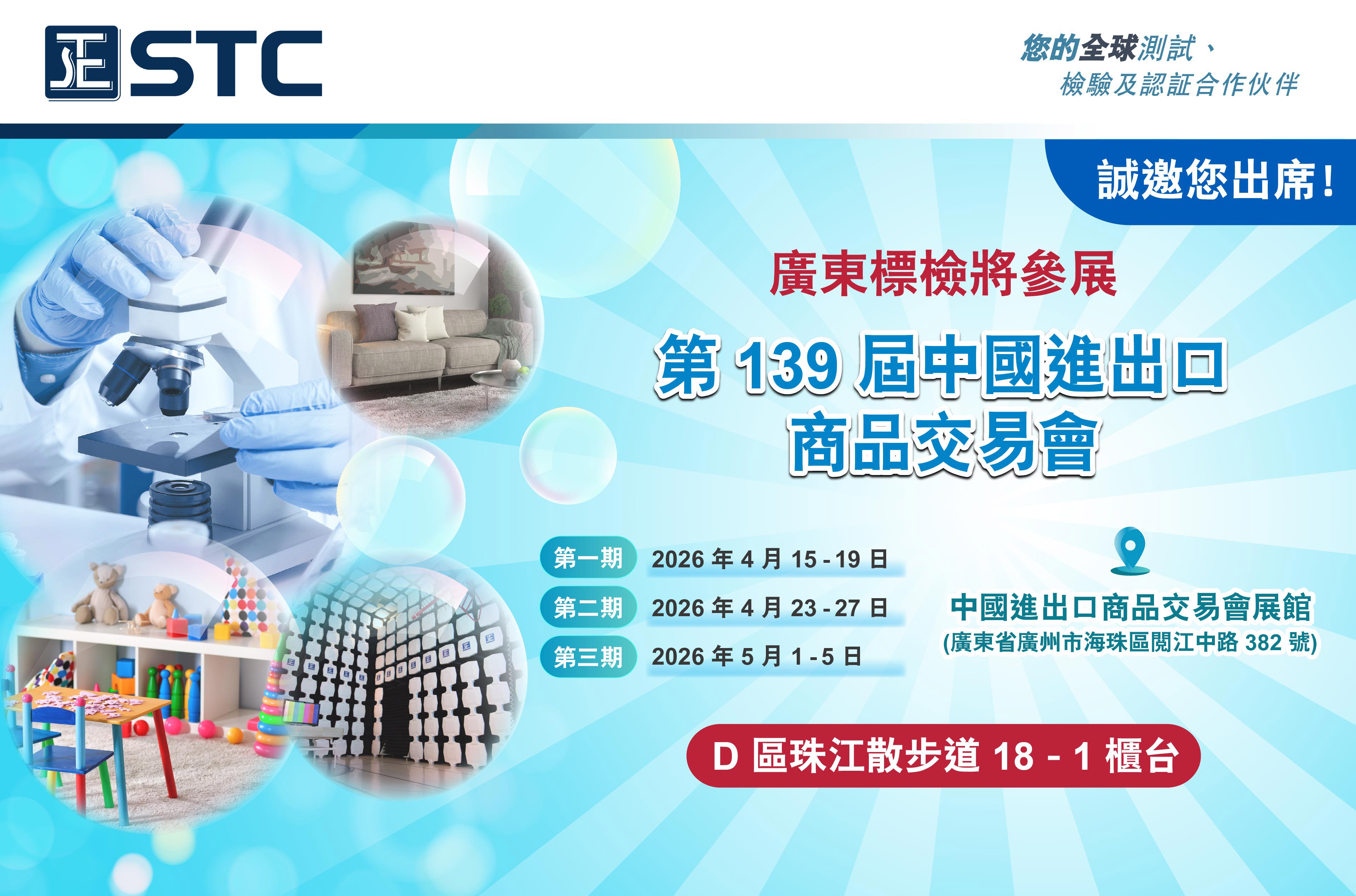 廣東標檢將參展第139屆中國進出口商品交易會第一期:2026年4月15-19日第二期:2026年4月23-27日第三期:2026年5月1-5日展位號碼:D區珠江散步道18-1櫃台中國進出口商品交易會展館(廣東省廣州市海珠區閱江中路382號)