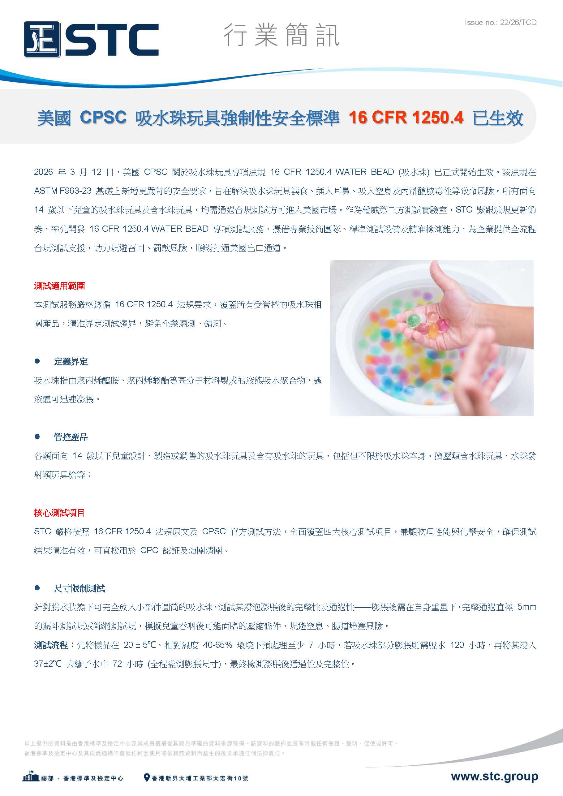 2026 年 3 月 12 日,美國 CPSC 關於吸水珠玩具專項法規 16 CFR 1250.4 WATER BEAD (吸水珠) 已正式開始生效。該法規在 ASTM F963-23 基礎上新增更嚴苛的安全要求,旨在解決吸水珠玩具誤食、插入耳鼻、吸入窒息及丙烯醯胺毒性等致命風險。所有面向 14 歲以下兒童的吸水珠玩具及含水珠玩具,均需通過合規測試方可進入美國市場。作為權威第三方測試實驗室,STC 緊跟法規更新節奏,率先開發 16 CFR 1250.4 WATER BEAD 專項測試服務,憑借專業技術團隊、標準測試設備及精准檢測能力,為企業提供全流程合規測試支援,助力規避召回、罰款風險,順暢打通美國出口通道。