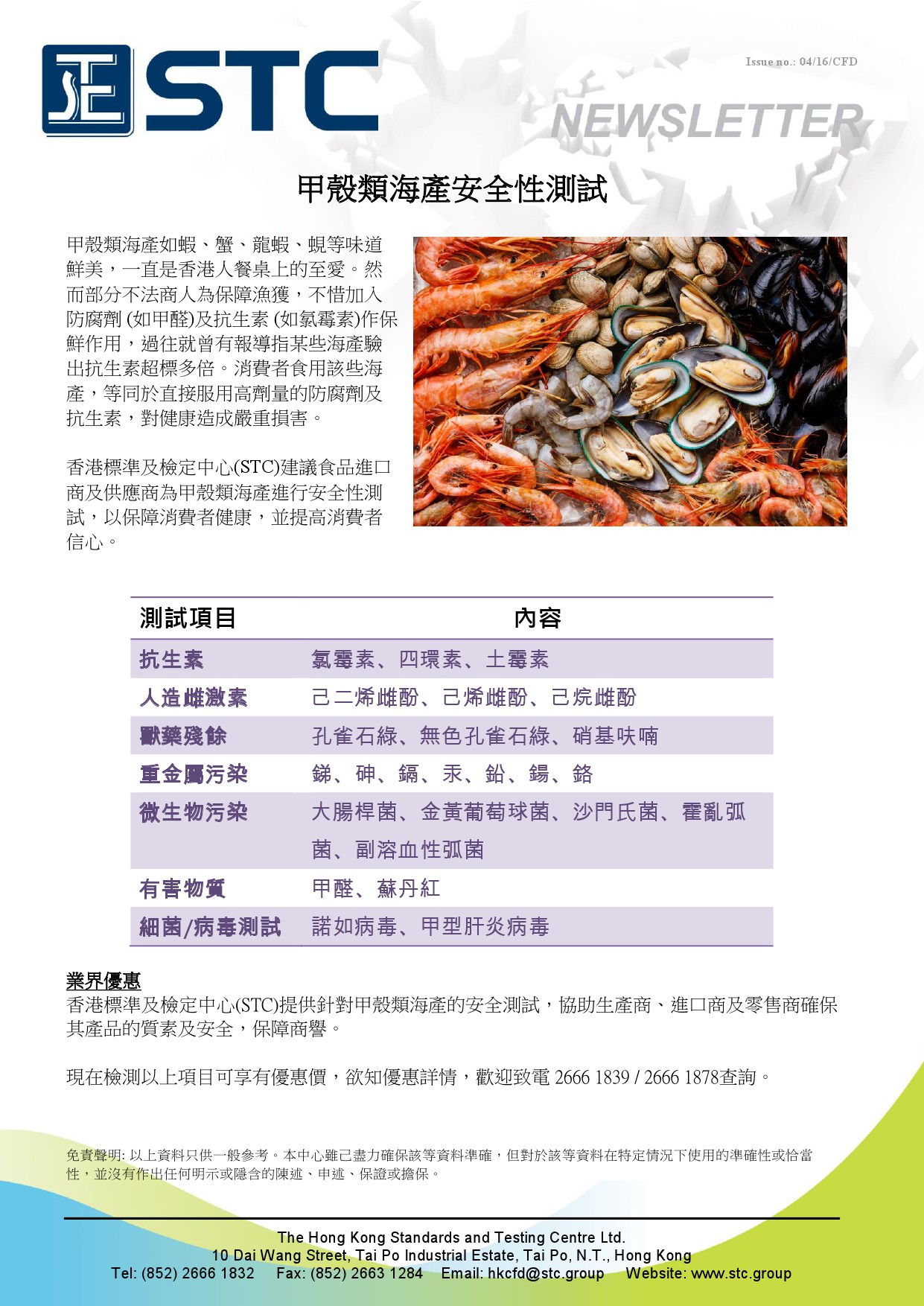 甲殼類海產如蝦、蟹、龍蝦、蜆等味道鮮美,一直是香港人餐桌上的至愛。然而部分不法商人為保障漁獲,不惜加入防腐劑 (如甲醛)及抗生素 (如氯霉素)作保鮮作用,過往就曾有報導指某些海產驗出抗生素超標多倍。消費者食用該些海產,等同於直接服用高劑量的防腐劑及抗生素,對健康造成嚴重損害。 香港標準及檢定中心(STC)建議食品進口商及供應商為甲殼類海產進行安全性測試,以保障消費者健康,並提高消費者信心。 STC提供針對甲殼類海產的安全測試,協助生產商、進口商及零售商確保其產品的質素及安全,保障商譽。